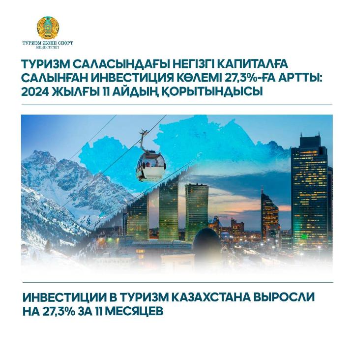 По итогам 11 месяцев 2024 года в Казахстане отмечается положительная динамика инвестиций в основной капитал (ИОК) в сфере туризма. Общий объем ИОК за этот период составил 777,4 млрд тенге, что на 27,3% превышает показатель аналогичного периода прошлого года (610,2 млрд тенге).