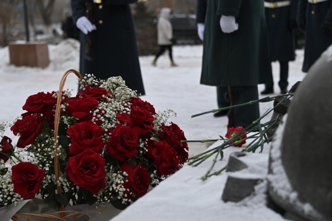 На городской площади Красногвардейского района Санкт-Петербурга казахстанские курсанты военного вуза почтили память снайпера Алию Молдагулову. Будущие офицеры возложили венки к бронзовой скульптурной композиции, которая была открыта на улице Батыра в Неве в 2019 году.