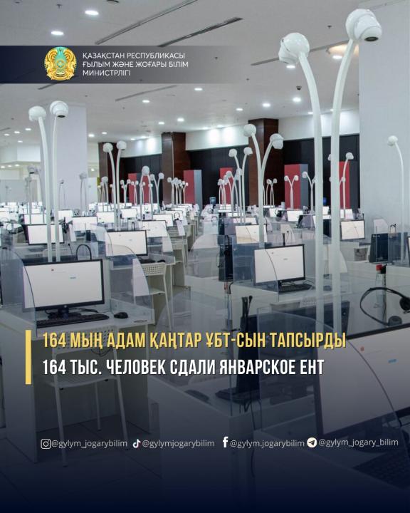 Около 164 тысяч человек сдали январское ЕНТ. Из них 76,81% абитуриентов сдали на казахском языке, 23,14% – на русском, 89 человека – на английском языке.