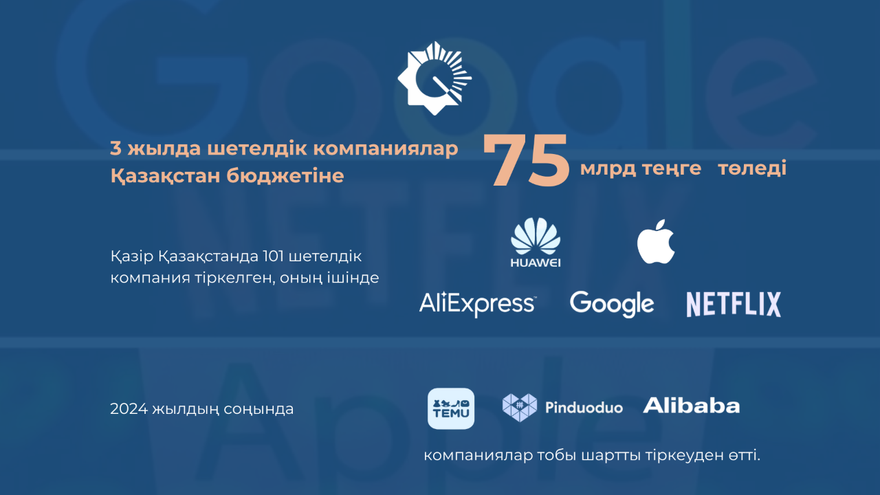 В настоящий момент в Казахстане зарегистрирована 101 иностранная компания, в числе которых Huawei, Aliexpress, Google, Apple, Netflix и другие международные структуры. За три года эти компании уплатили налогов на 75 млрд тенге. За последний год – 35 млрд тенге.