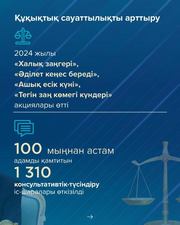 Так, в 2024 году запущены акции «Народный юрист», «Юстиция консультирует», «День открытых дверей», «Дни бесплатной юридической помощи» по предоставлению правовой помощи и консультаций, встречи с населением во всех регионах.За прошлый год во всех регионах республики было проведено 1 310 консультативно-разъяснительных мероприятий с общим охватом более 100 тыс. человек.