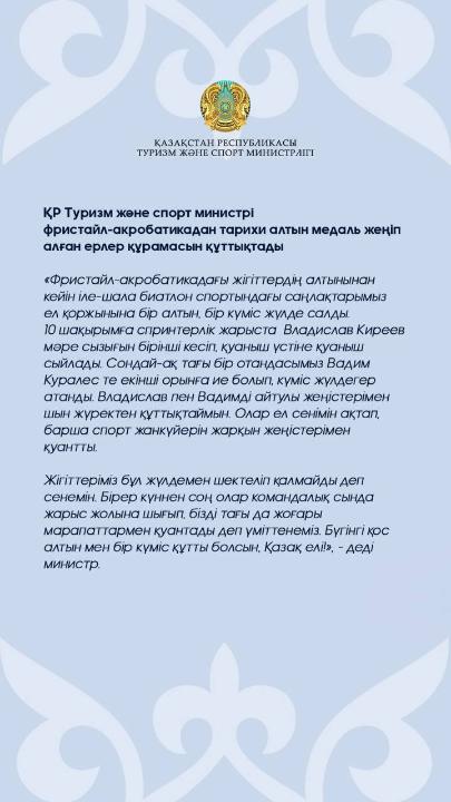 Поздравляю всех с этим знаменательным днем двойного золото и серебряной победы! Алға, Қазақстан!», — сказал Министр.
