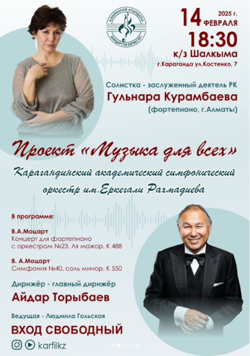 В Караганде вместе с академическим симфоническим оркестром им. Еркегали Рахмадиева выступит известная пианистка заслуженный деятель РК Гульнара Курамбаева. Любителей музыки приглашают в концертный зал «Шалкыма» 14 февраля в 18:30.