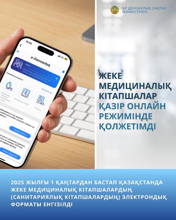 С 1 января 2025 года в Казахстане вводится электронный формат персональных медицинских карт (санитарных книжек). Граждане теперь могут получать результаты медицинского осмотра и данные своей медицинской книжки через сервис «Е-Денсаулык» в мобильном приложении egov, что значительно сокращает время прохождения медицинского осмотра и исключает необходимость повторного посещения терапевта. По готовности санитарной книжки граждане получат СМС-уведомление с номера 1414.