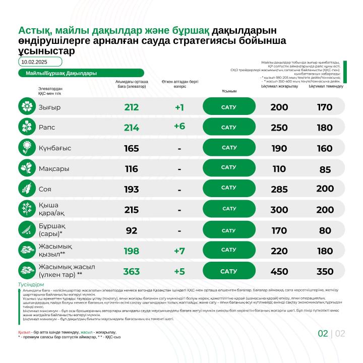 Текущая цена – средневзвешенные цены с НДС внутри Казахстана на элеваторе или на вагоне, по которым заключаются контракты. Цены могут варьироваться в зависимости от региона, качественных показателей, условий поставки.