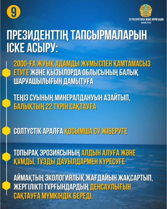 «Не может не вызывать беспокойства высыхание Аральского моря и опустынивание его территории. Следует рекультивировать территорию, пострадавшую от экологической катастрофы. Кроме того, важно эффективно использовать водные ресурсы трансграничных рек. Для этого необходимо шире применять водосберегающие технологии», – Президент Республики Казахстан Касым-Жомарт Токаев.