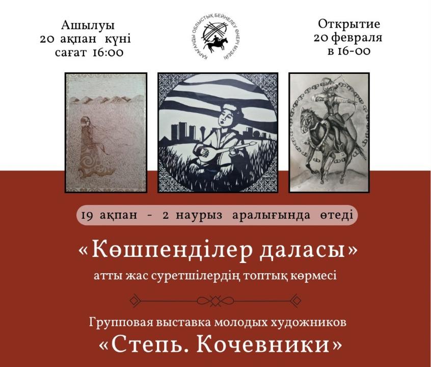 Более 30 работ 15 молодых художников будет представлено на выставке «Степь. Кочевники» в Карагандинском областном музее изобразительного искусства. Экспозиция откроется 20 февраля в 16:00.