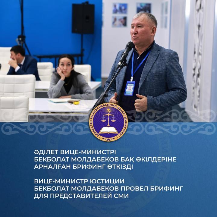 Вице-министр юстиции Республики Казахстан Бекболат Молдабеков провел брифинг в Службе центральных коммуникаций и ответил на вопросы журналистов о новых цифровых проектах.