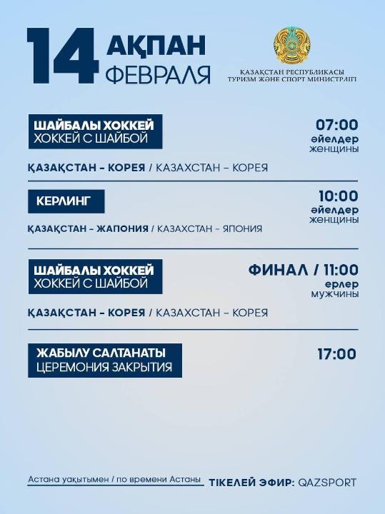 Программа выступления спортсменов Национальной сборной РК на IX зимних Азиатских играх: 14 февраля