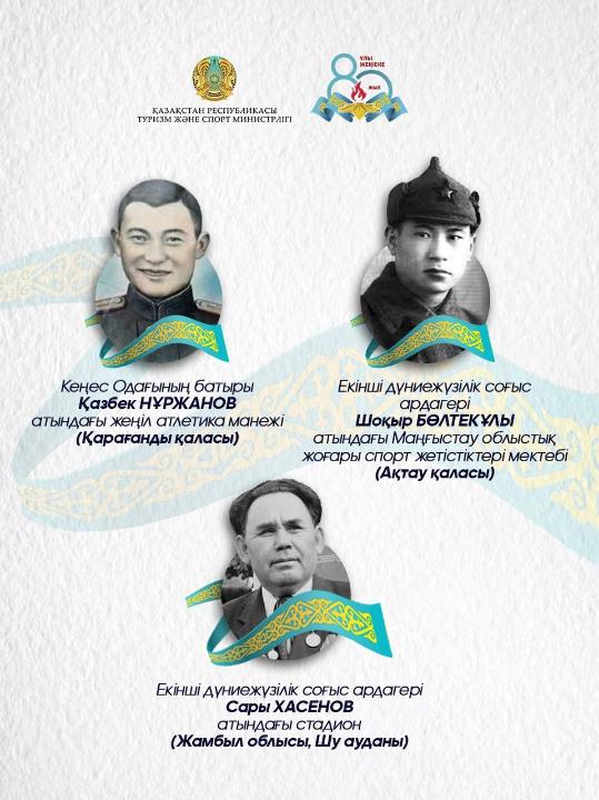К 80-летию Победы Министерство туризма и спорта Республики Казахстан представляет информацию о спортивных объектах, названных в честь героев Второй мировой войны.