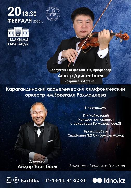 Карагандинский симфонический оркестр имени Еркегали Рахмадиева 20 февраля в 18:30 приглашает на концерт. Солист – Аскар Дуйсенбаев (скрипка, Астана).