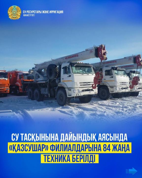 «Министерство водных ресурсов и ирригации планирует обеспечить филиалы «Казводхоза», в общей сложности, 757 новыми единицами техники и спецоборудования. Среди них – экскаваторы, тяжёлые грузовики, тракторы и др. Кроме того, будут приобретены 8 новых земснарядов – это судна для очистки дна водохранилищ от различных отложений. Специальная техника позволит снизить последствия паводков, увеличить пропускную способность каналов и увеличить накапливаемый ими объем воды за счет дополнительных свободных емкостей»,– сообщил вице-министр водных ресурсов и ирригации Ерболат Ибрайханов.
