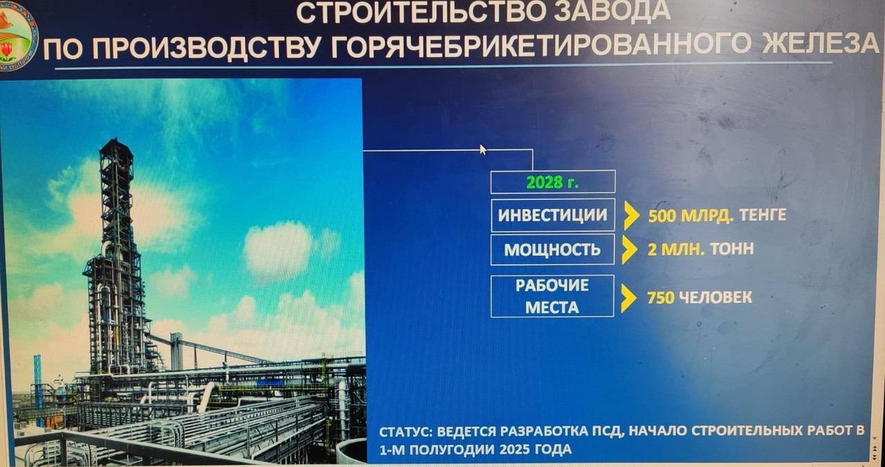 К таким проектам относится – проект по строительству завода по производству горячебрикетированного железа (АО «ССГПО») с производственной мощностью 4 млн тонн, стоимостью 920 млрд тенге с созданием 1,1 тысяч рабочих мест.