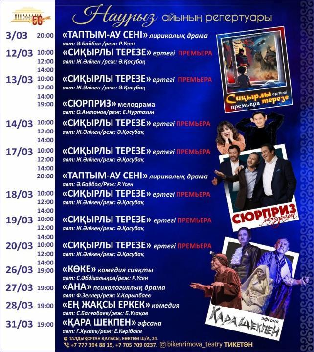 Репертуар постановок Талдыкорганского драматического театра им. Б. Римовой на март 2025 года