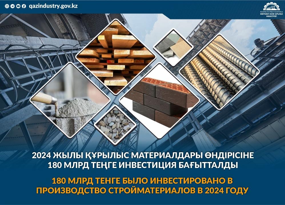 Объем инвестиций в основной капитал по отрасли составил 180 млрд. тенге. В 2024 году запущены завод ТОО «ТехноНиколь-Казахстан» по производству теплоизоляционных материалов в Алматинской области, завод ТОО «Корцем» по производству цемента в Жамбылской области, завод ТОО «Ван Шэн Керамический» по производству керамической плитки в Шымкенте и другие проекты.