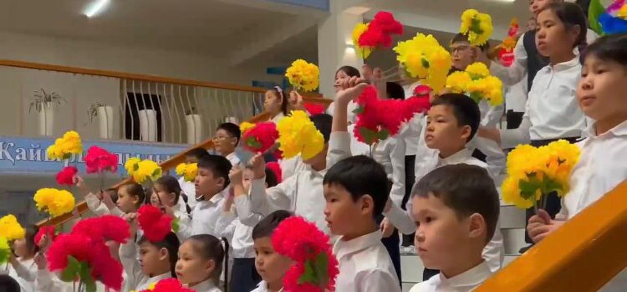 В трогательной видеозаписи, снятой в стенах школы, учащиеся начальных классов исполнили песню учителя музыки Талгата Желдибаева «Алғыс айту».