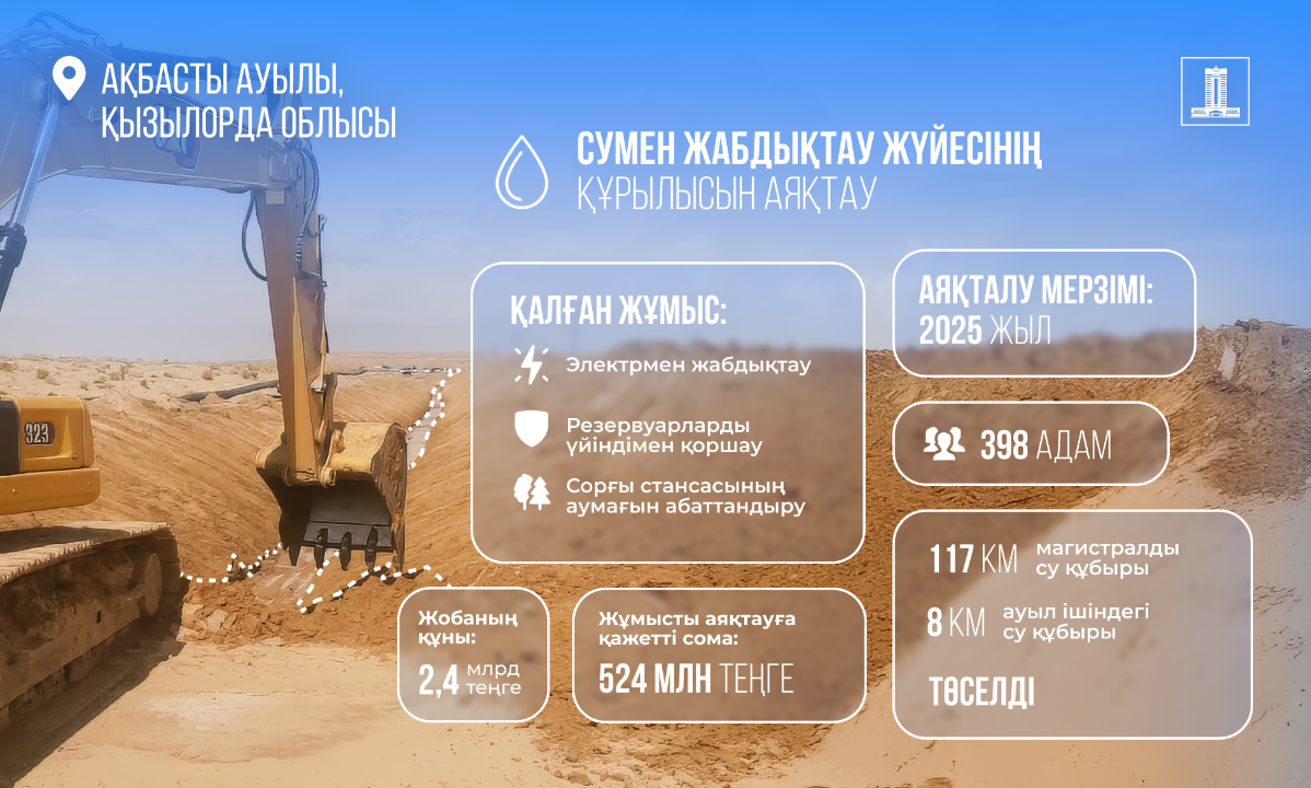 С целью обеспечения централизованным водоснабжением сел Токабай и Абай с населением более 3 тыс. человек ведется строительство ветки подключения к магистрали Аральск-Токабай-Абай Арало-Сарыбулакского группового водопровода. Реализация данного проекта началась в 2021 году. Для его завершения дополнительно требуется порядка 3,7 млрд тенге. Решение о выделении средств уже принято. Сдача объекта в эксплуатацию планируется до конца 2025 года.