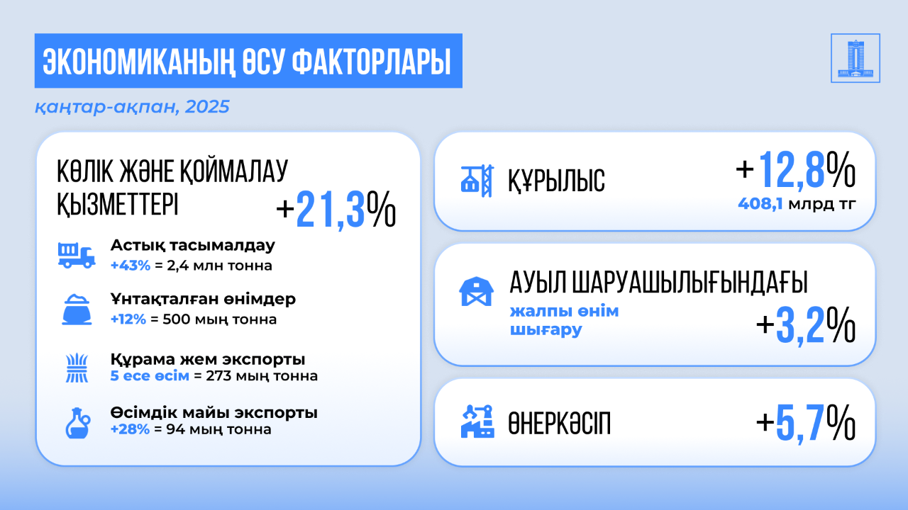 Высокие темпы сохраняются в строительстве, где объем работ составил 408,1 млрд тенге, ИФО – 112,8%. В сфере торговли динамика роста составила 6%, услуги транспорта и складирования выросли на 21,3%. В целом отмечен высокий вклад предприятий оптовой торговли, реализующих зерно, семена и корма для животных (рост в 5,8 раз), фармацевтические товары (на 44,6%), автомобили и легкие автотранспортные средства (на 38,8%). Перевозки зерна увеличились на 43%, достигнув 2,4 млн тонн. Перевозки продуктов перемола выросли на 12%.