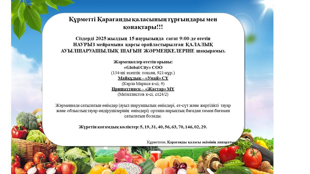 В Караганде 15 марта пройдут городские сельскохозяйственные мини-ярмарки, приуроченные к празднованию Наурыза. Начало торговли в 09:00.