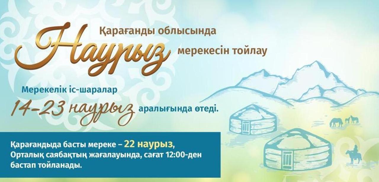 19 марта – Жаңару күні (День обновления). Пройдут экологические акции, посадка деревьев и тематические мероприятия. В рамках акции «Әкенің еккен ағашы-ұрпаққа сая» коллектив кинотеатра «Сарыжайлау» организует посадку саженцев в зимнем саду Темиртау. Кроме того, в Театре им. К. С. Станиславского состоится благотворительный показ театрализованного представления «Наурыз».