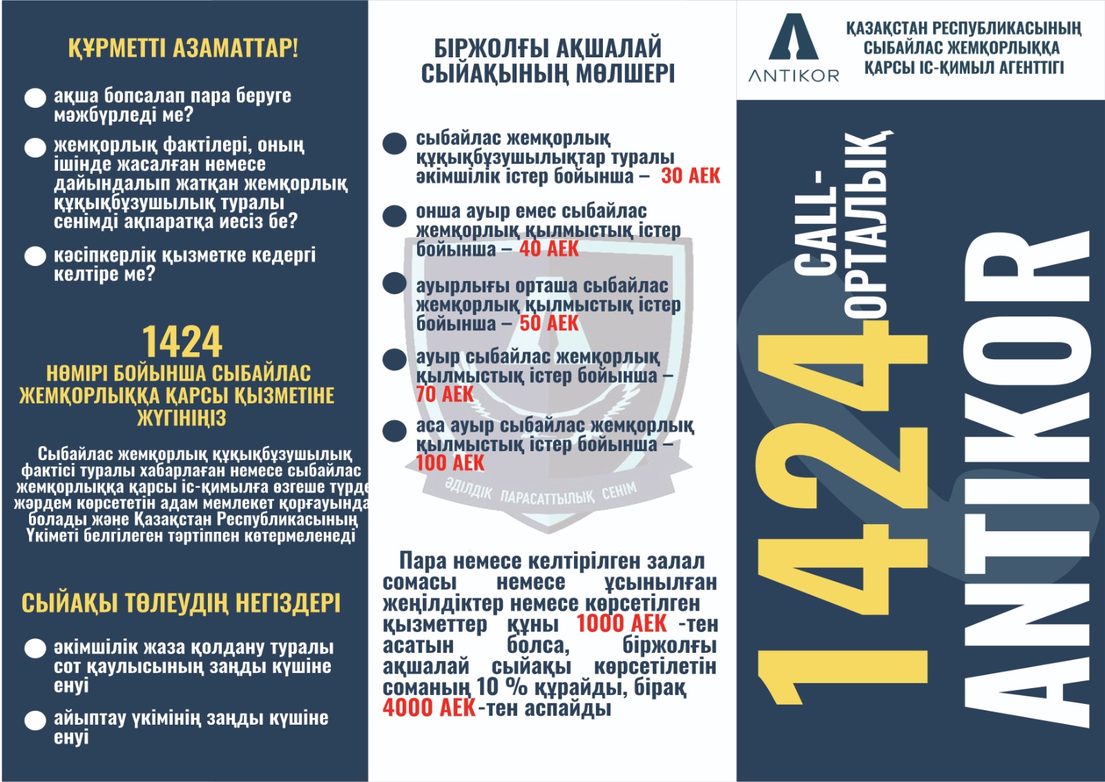 О фактах коррупции необходимо сообщить в Сall-центр Антикоррупционной службы по номеру 1424 (звонок по Республике бесплатный) либо обратиться в территориальный Департамент расположенный по адресу: Алматинская область, Илийский район, п.Отеген батыр, ул.Титова 33А.