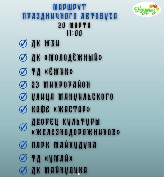 Автобусы «Наурыз керуені» стартуют с 11:00. Молодёжные творческие коллективы выступят с концертами в разных локациях.