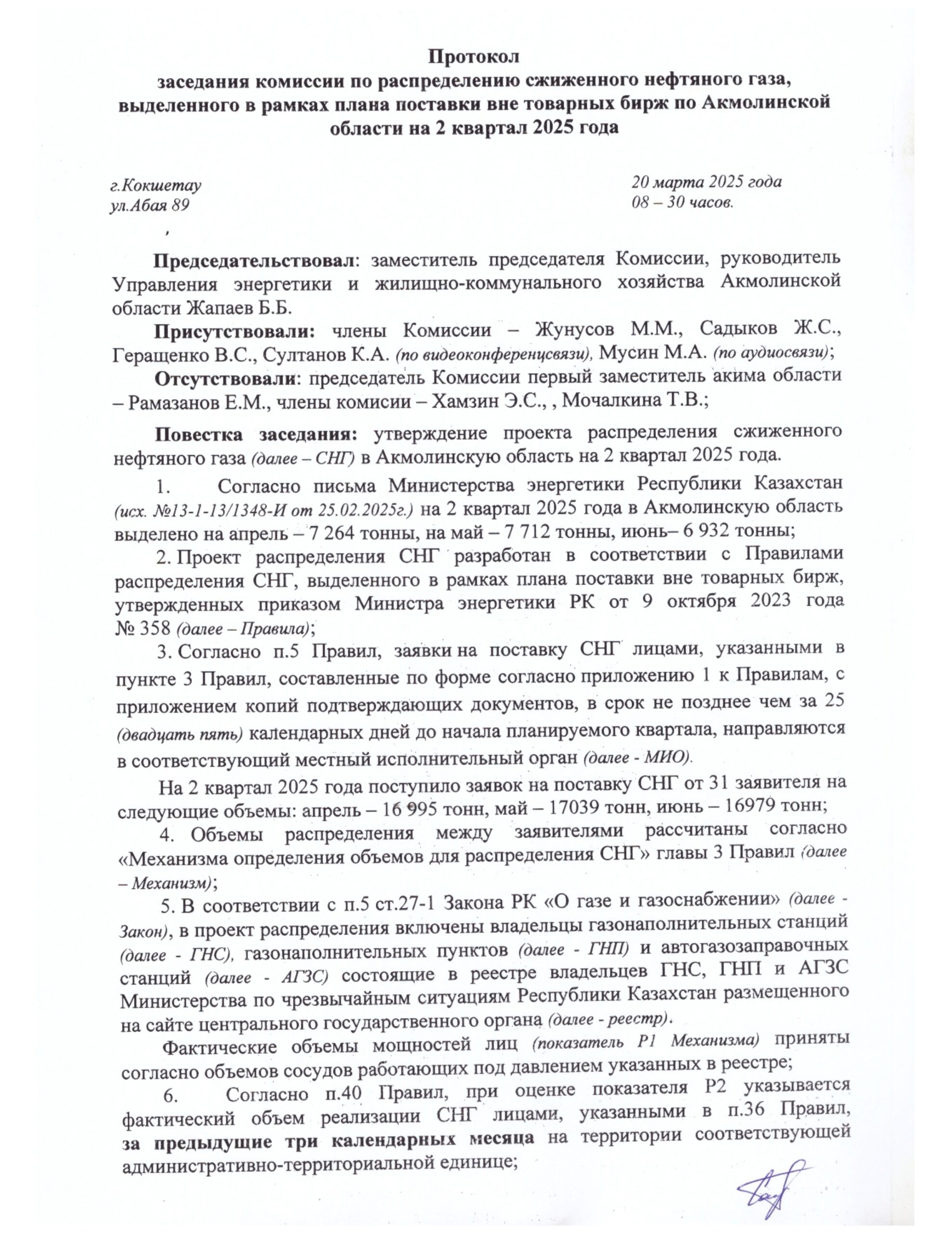 20 марта 2025 года проведено распределение сжиженного нефтяного газа, выделенного в рамках плана поставки вне товарных