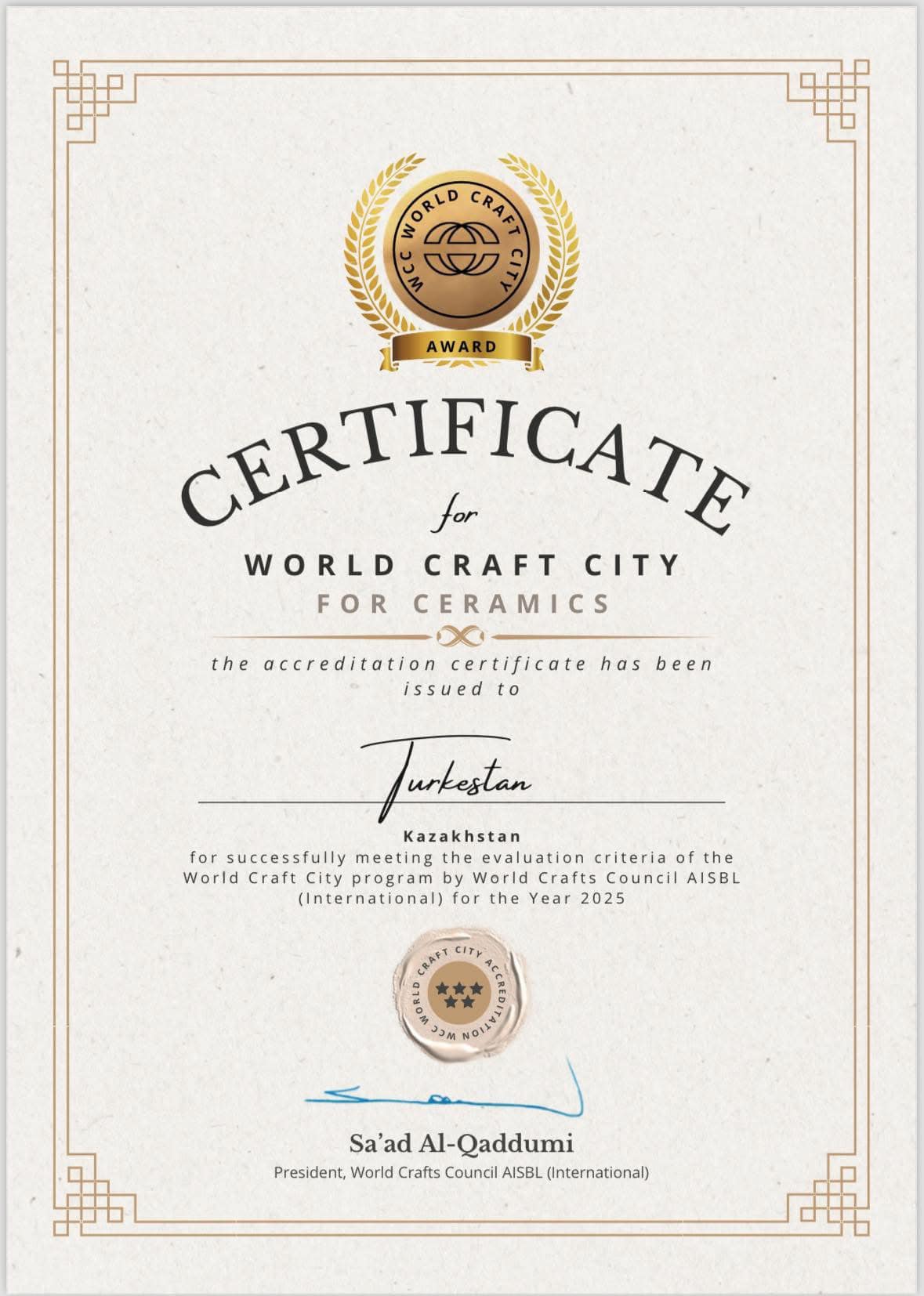 В ходе переговоров аким города выразил намерение получить статус «Международного города ремесленников», и была подана заявка. В результате сегодня город Туркестан официально получил сертификат, подтверждающий статус «Город ремесленников».