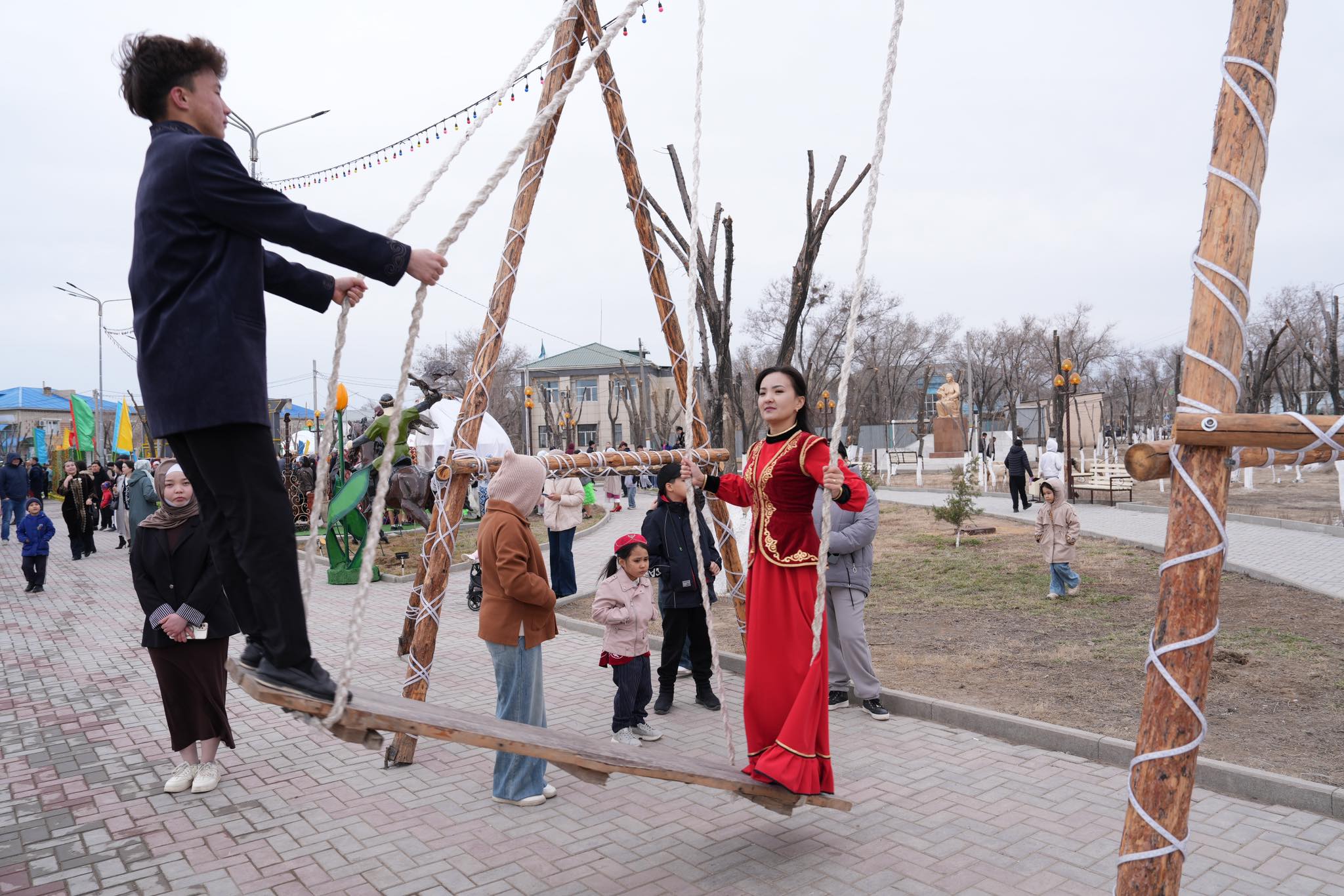 На центральной площади была организована выставка народных ремесел и исторических экспонатов, проведены соревнования по национальным играм и айтыс. Глава региона поздравил жителей с праздником Наурыз.