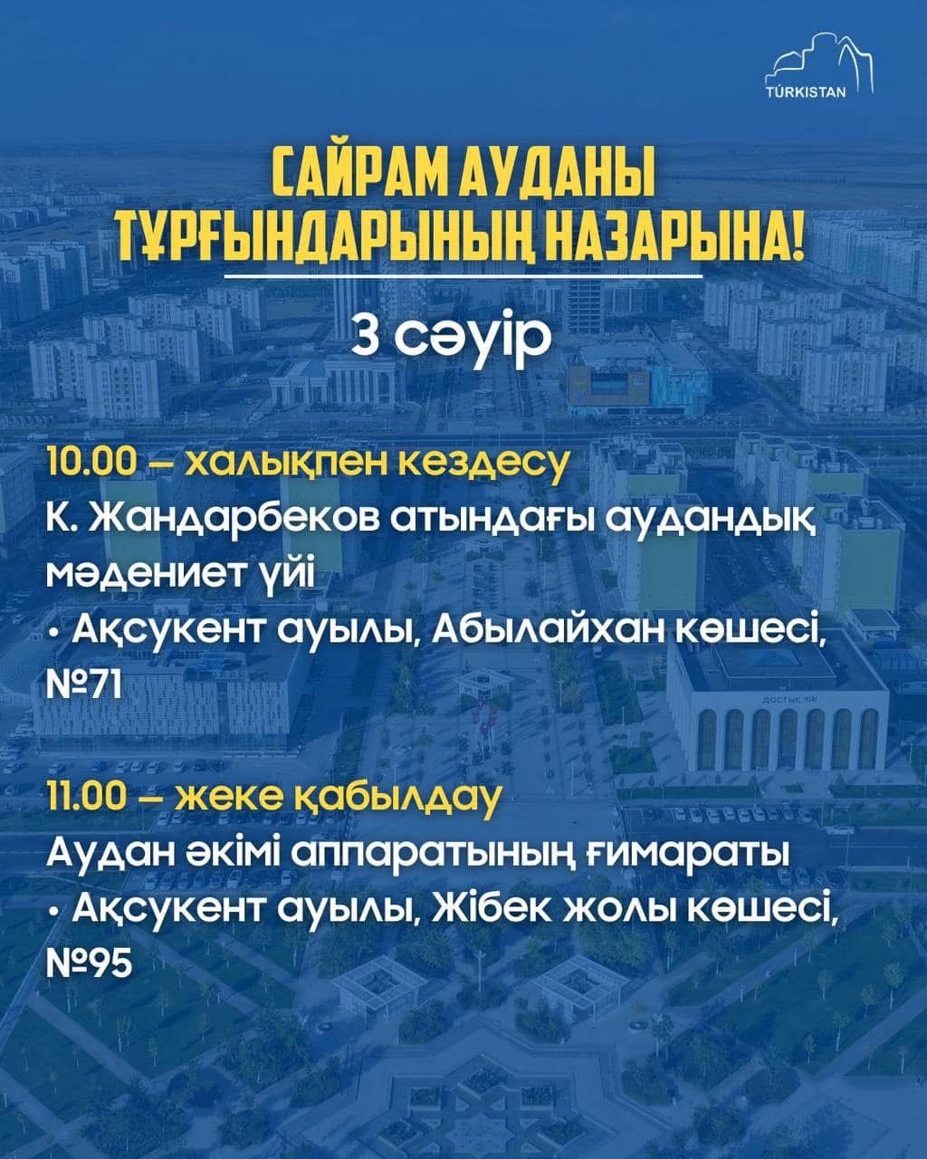 В рамках реализации Указа Президента Республики Казахстан от 3 марта 2022 года №826 «О проведении встреч акимов с населением» сообщаем, что встреча акима Туркестанской области Кушерова Нуралхана Оралбаевича с жителями Сайрамского района состоится 3 апреля 2025 года в 10.00 часов в доме культуры имени К.Жандарбекова (Сайрамский район, улица Абылай хан, №71), личный прием в 11.00 часов в здании Аппарата акима Сайрамского района (Сайрамский район, улица Жибек жолы, №95).