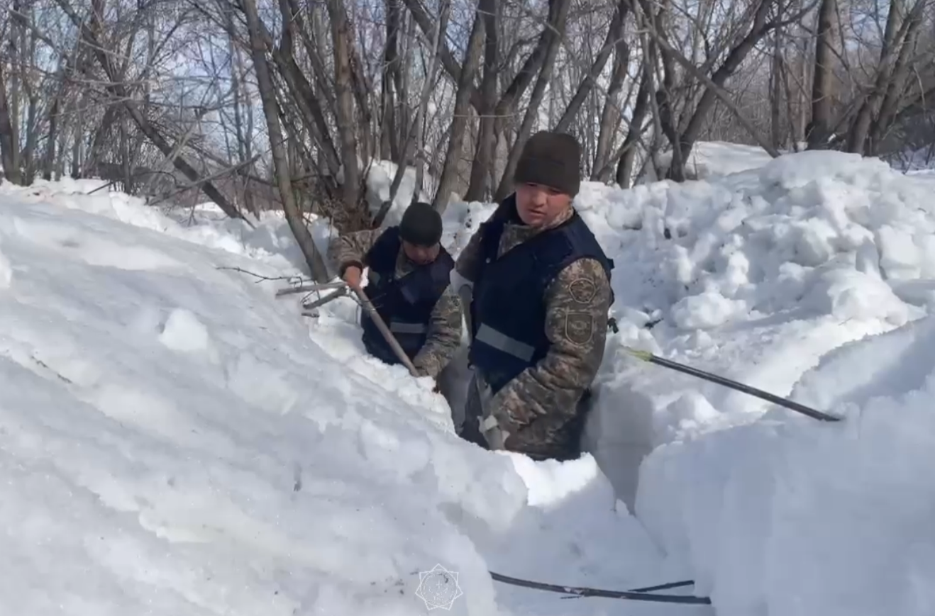 В районе Алтай Восточно-Казахстанской области военнослужащие в/ч 68303 МЧС РК очищают от снега труднодоступные участки и расчищают водопропускные сооружения и арыки, чтобы талая вода могла беспрепятственно уходить.