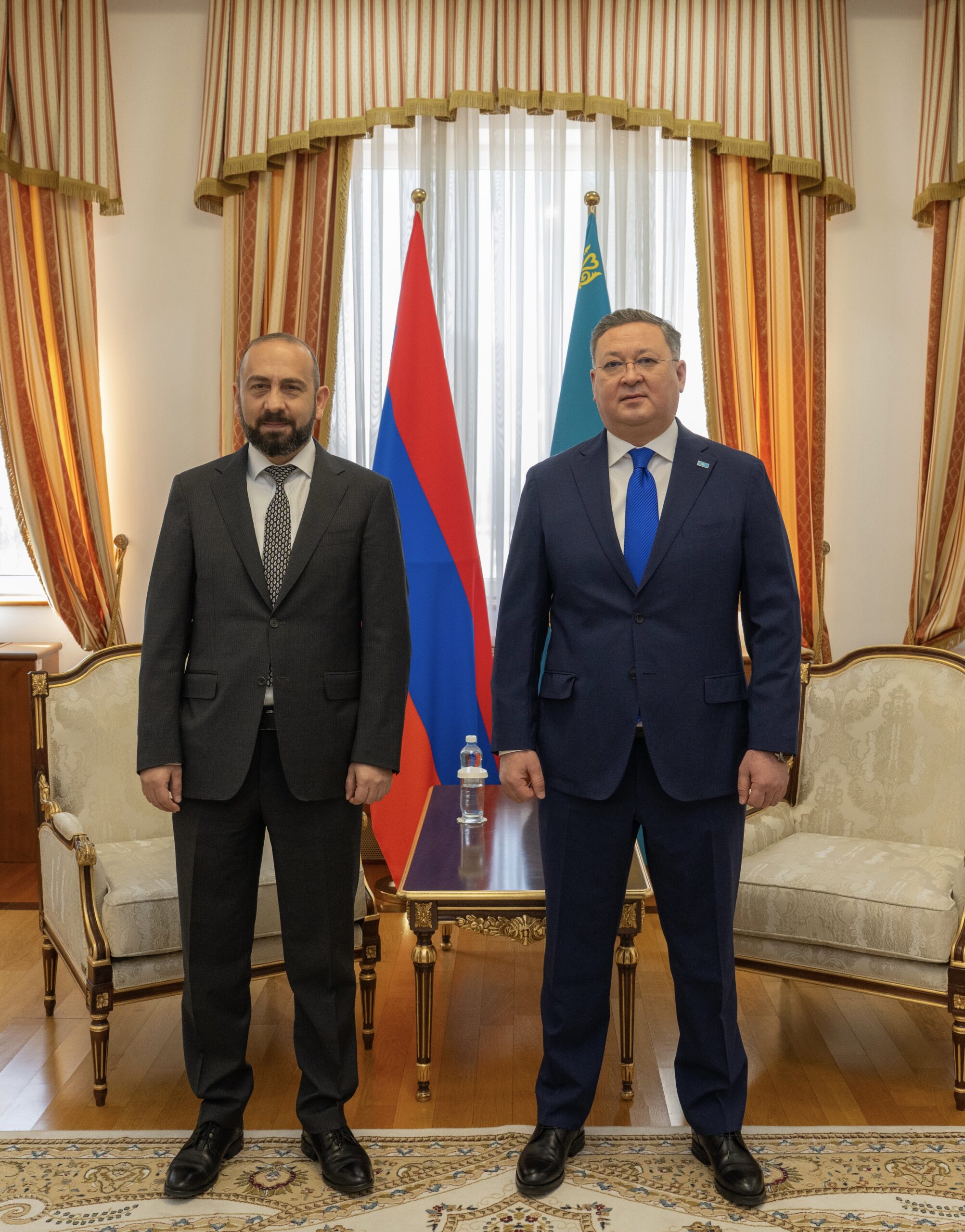 Астана, 27 марта 2025 года – Заместитель Премьер-министра – Министр иностранных дел Республики Казахстан Мурат Нуртлеу провёл встречу с Министром иностранных дел Республики Армения Араратом Мирзояном, прибывшим в Астану с первым официальным визитом.