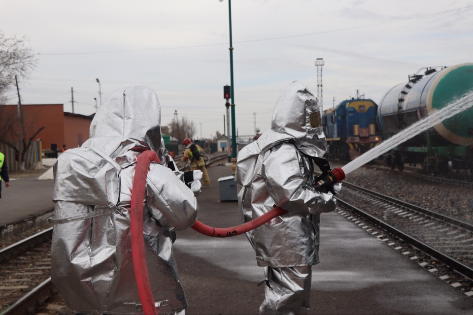 Сегодня на железнодорожном вокзале города Кызылорда проведены пожарно-тактические учения с целью отработки тушения пожаров в цистернах, перевозящих нефтепродукты.