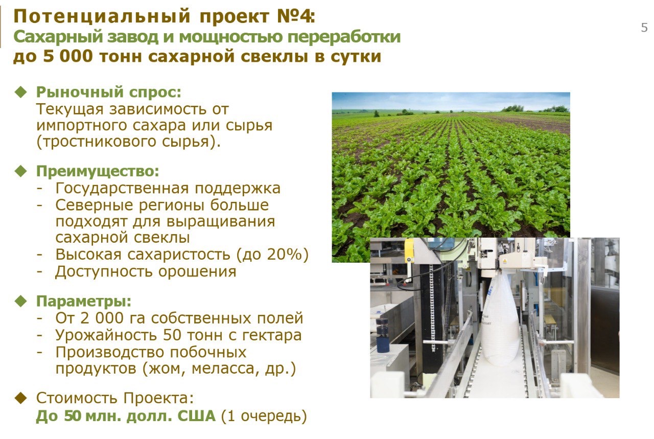«Реализация проекта позволит перерабатывать до 5 тыс тонн сахарной свеклы в сутки. Половину сырья планируем выращивать на своих полях, оставшуюся часть закупать у соседних фермеров», — отметил Габиден Балгинбеков.