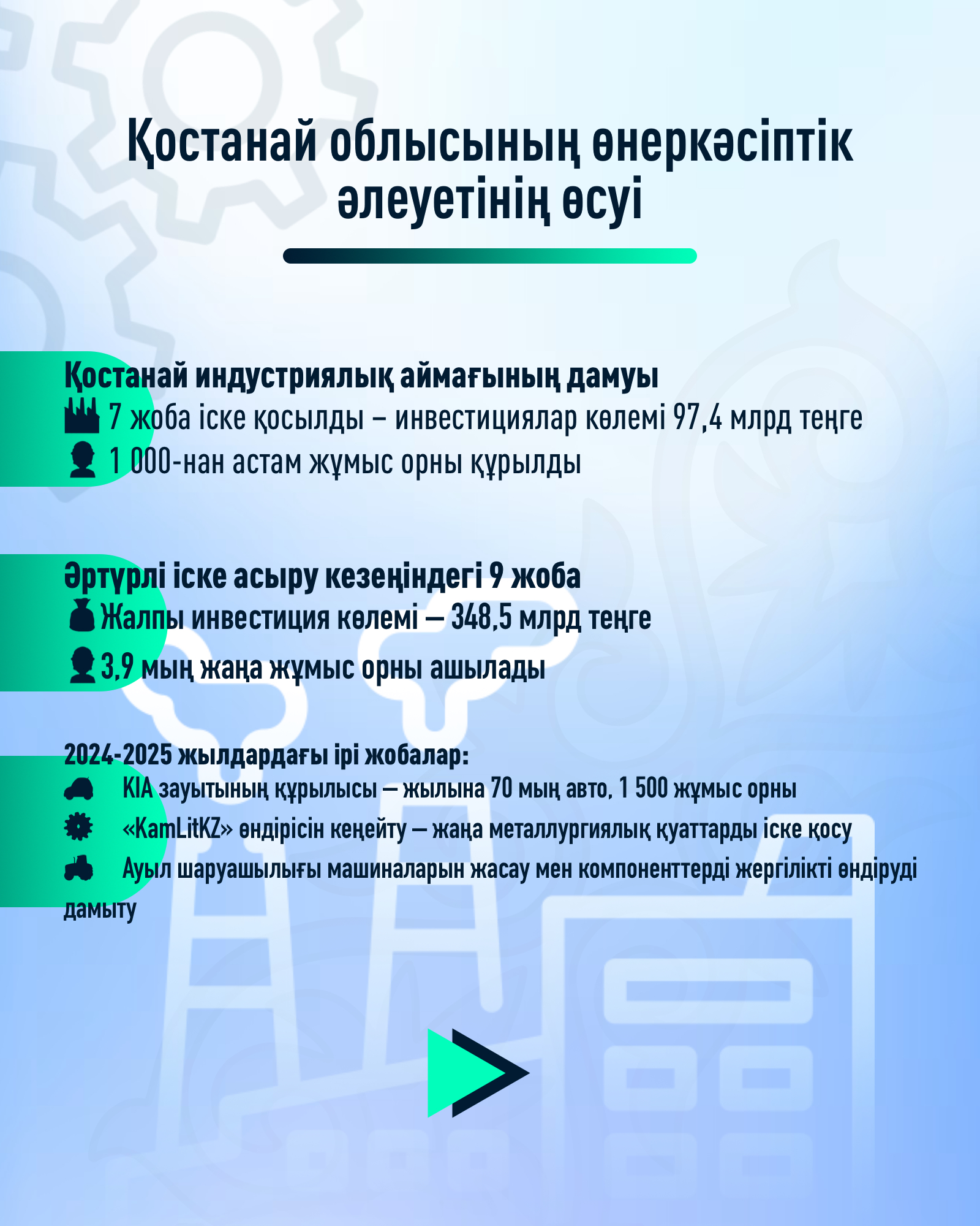 Қазіргі уақытта Қостанай қаласының Индустриялық аймағында жалпы құны 97,4 млрд теңгені құрайтын 7 жоба іске қосылды, 1 000-нан астам жаңа жұмыс орны құрылды.