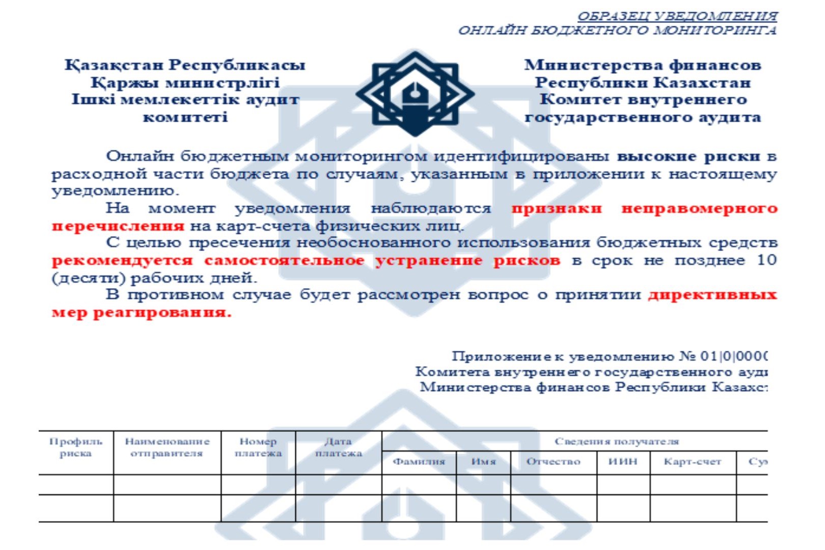 В этой связи Комитет полагает важным поделится некоторыми рабочими аспектами в рамках применения цифрового инструмента, в частности показать обществу и участникам бюджетного процесса как выглядит уведомление системы ОБМ направляемое в адрес объектов финансового мониторинга.