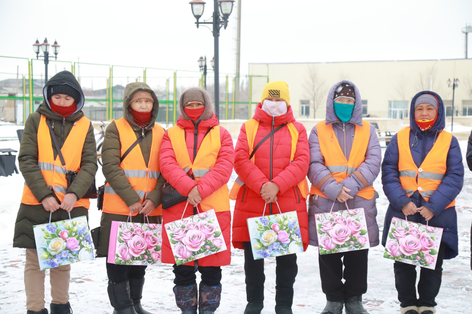Аким района сначала пообщался с работницами в аллее «Жалаңтөс Бахадүр» и на площади «Даңқ» и выразил им свои теплые поздравления.