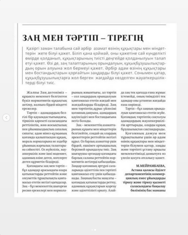 🔹В газете «Astana Aqshamy» опубликована статья главного специалиста отдела контроля в сфере регистрационной службы и регистрации некоммерческих организаций Департамента юстиции города Астаны М.Мейрамбаевой.