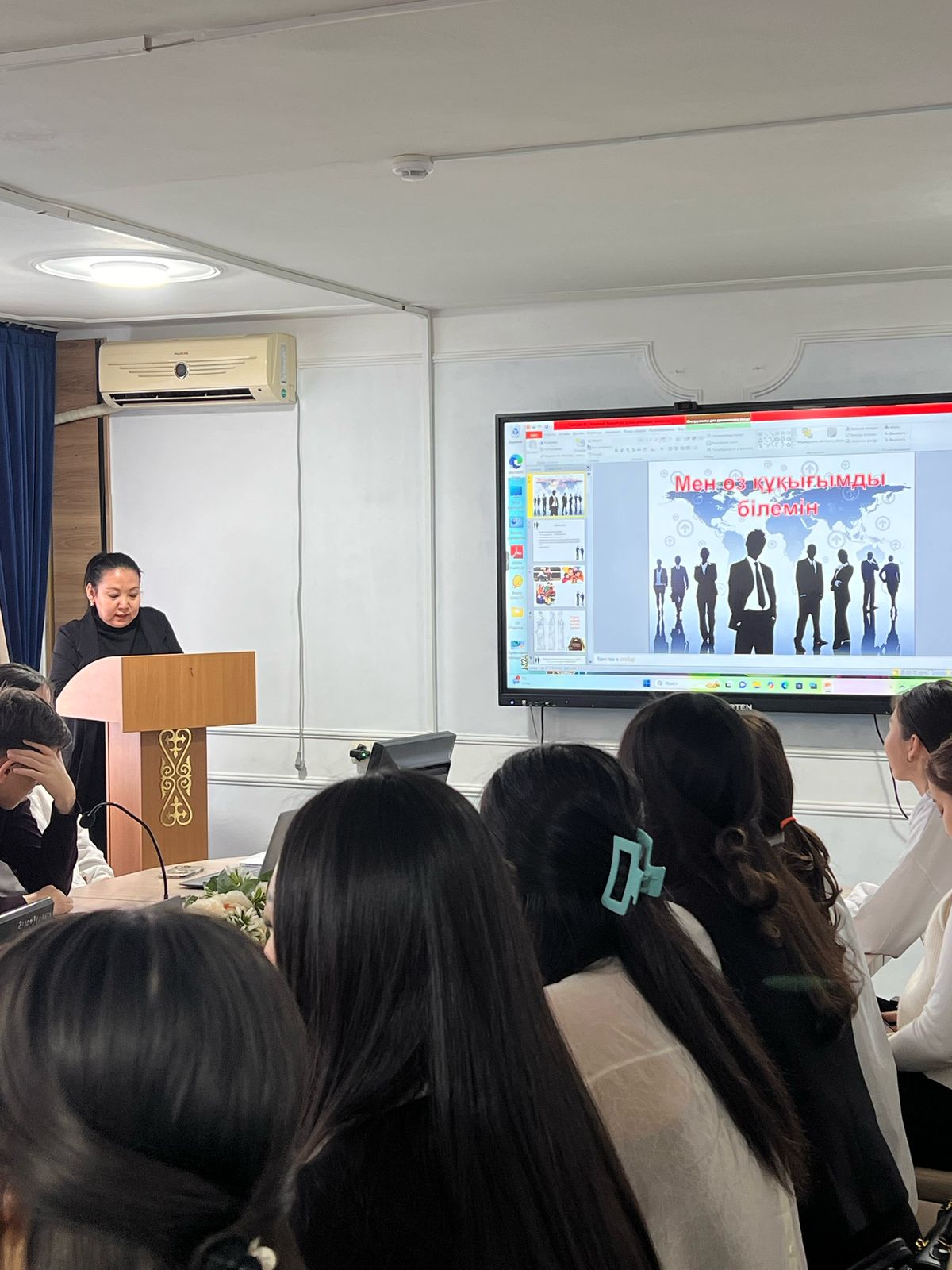 27 марта 2025 года сотрудники Департамента юстиции Жамбылской области совместно с адвокатом коллегии адвокатов Жамбылской области провели встречу со студентами Жамбылского гуманитарного высшего колледжа имени Абая на тему: «Я знаю свои права». Мероприятие организовано в рамках нарратива «Закон и порядок».