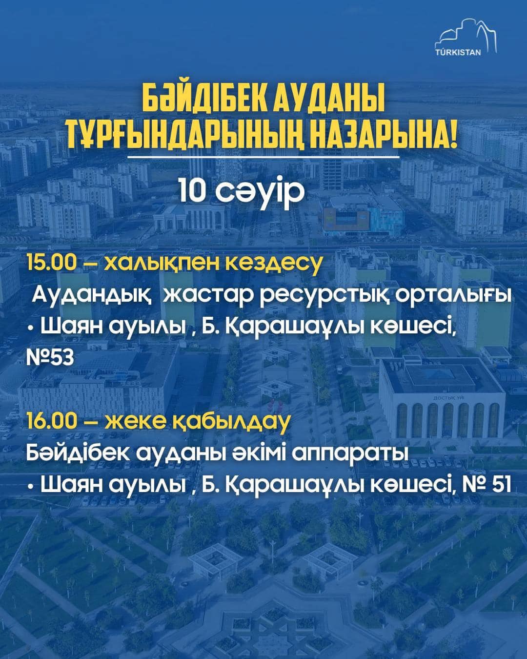 3 марта 2022 года №826 «О проведении встреч акимов с населением» сообщаем, что встреча акима Туркестанской области Көшеров Нуралхана Оралбаевича с жителями района Байдибек состоится 10 апреля 2025 года в 15.00 часов в районном молодежном ресурсном центре