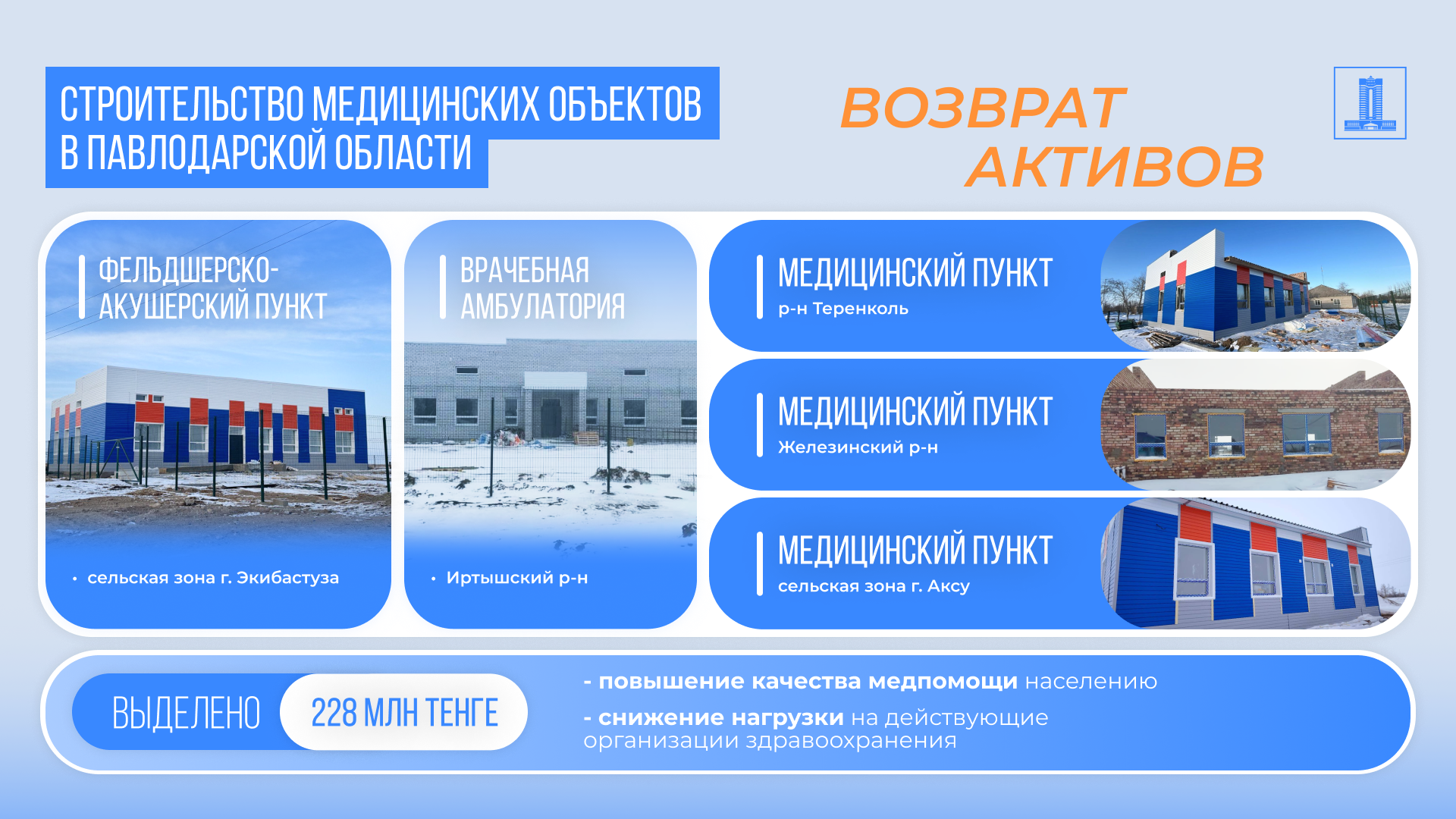 В соответствии с поручением Главы государства Правительством реализуются социальные проекты за счет возвращенных в страну незаконно выведенных активов. Из Специального государственного фонда выделено более 228 млн тенге на строительство медицинских объектов в Павлодарской области.