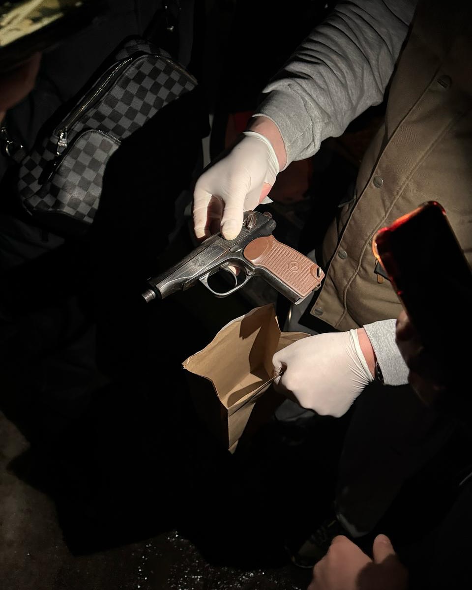 Далее в ходе обыска автомашины одного из задержанных с применением служебной собаки в багажнике обнаружен и изъят 1 пакет с веществом растительного происхождения, а также пистолет без регистрационных номеров с 6-ю боевыми патронами.