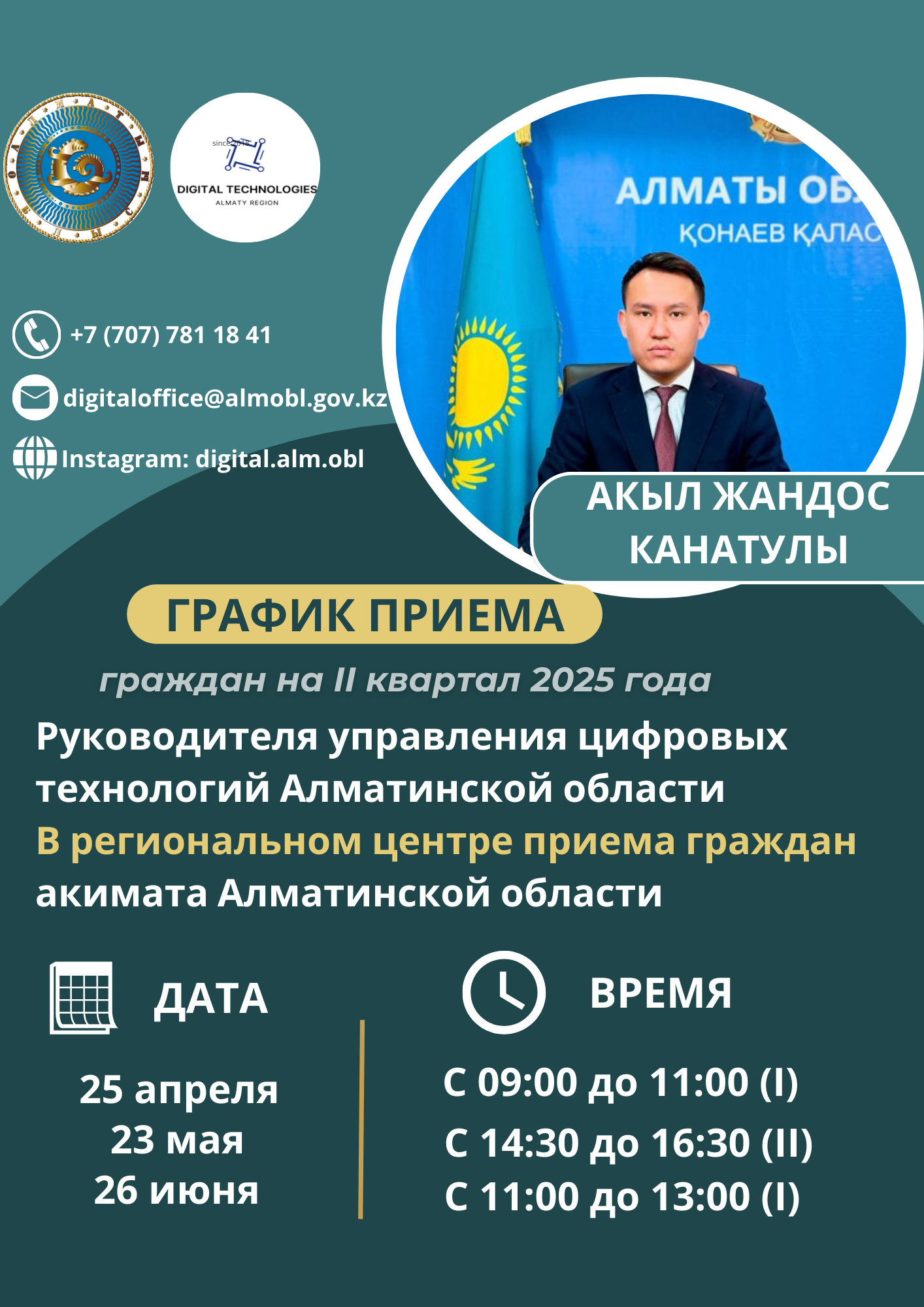 График приема граждан на ІІ квартал 2025 года руководителя управления цифровых технологий Алматинской области Акыл Жандоса Канатулы в региональном «Центре приема граждан».