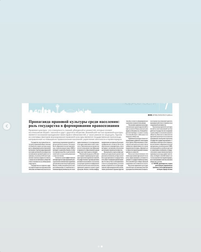 🔸29 марта 2025 года руководитель Отдела регистрации нормативных правовых актов Департамента Чукуев А.А. по вопросам формирования правовой культуры в обществе опубликовал статью в газете Вечерняя Астана на тему «Пропаганда правовой культуры среди населения: роль государства в формировании правосознания».