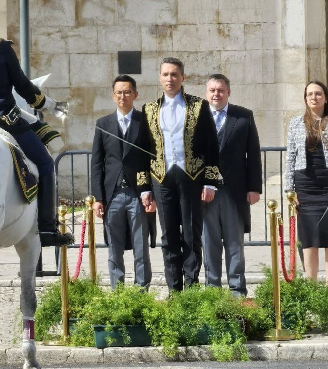 Лиссабон, 31 марта 2025 года – На исторической площади Праса-ду-Империу, а затем в Беленском дворце состоялась торжественная церемония вручения верительных грамот Чрезвычайным и Полномочным Послом Республики Казахстан Жаном Галиевым Президенту Португальской Республики Марселу Ребелу де Соуза.