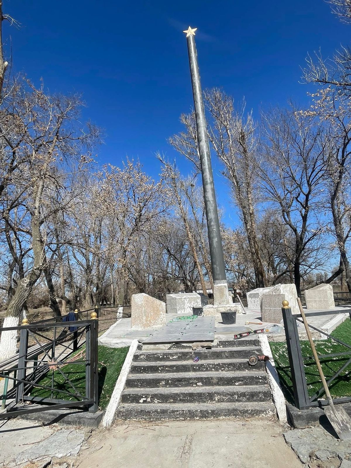 Также ход проведения ремонтных работ на мемориале «Обелиск Славы» в селе Кызылжар, сельский округ Ескелды.