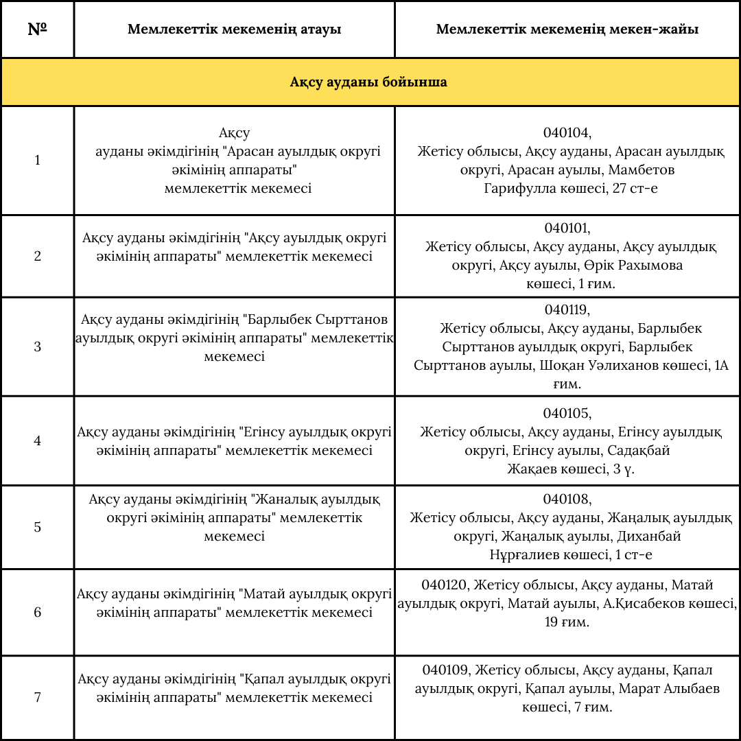 Список «Кабинетов права» открытых в сельских местностях области Жетісу. Доступ к правовой информации для предоставления возможности сельскому населению самостоятельного изучения законодательства Республики Казахстан.