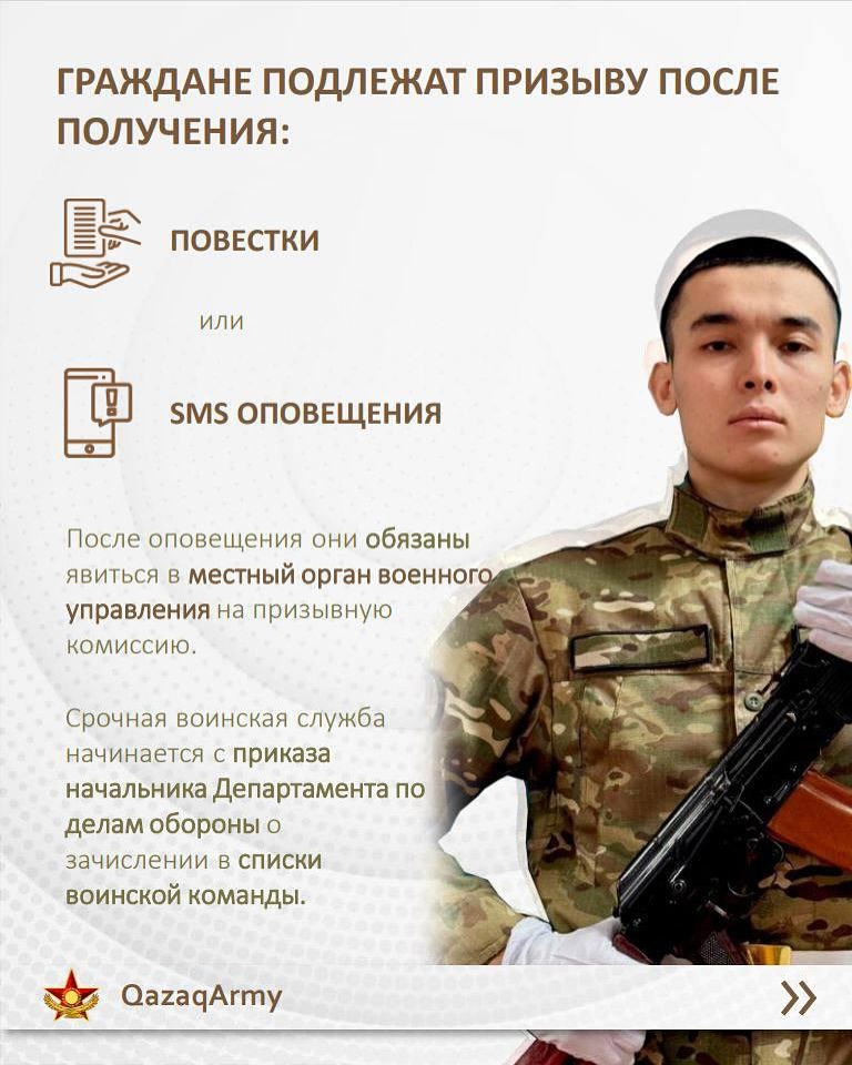 1 марта в Казахстане стартует весенняя призывная кампания в Вооруженные силы, другие войска и воинские формирования. Как проходит оповещение призывников? Чем государство обеспечивает солдат? Какие им положены льготы и как служба в армии может повлиять на дальнейшую жизнь? Ответы на все эти вопросы вы получите из инфографики.