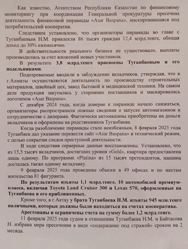 7 апреля акимом Белоглинского сельского округа Баймухановым Ж.Б., совместно с УИП Доспуловым Т.М. проведена встреча с населением округа по вопросу деятельности финансовых пирамид, в том числе «Asar Baspana»