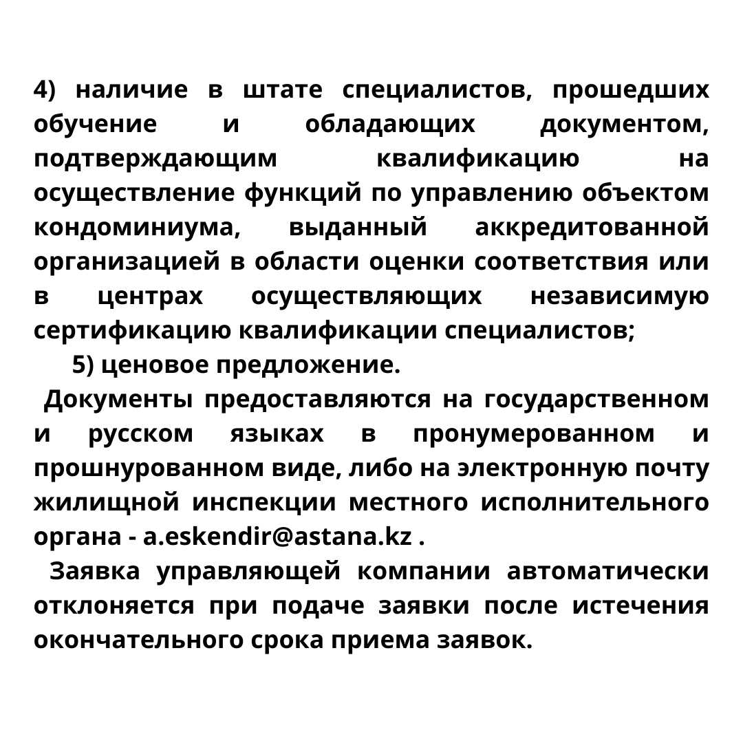 Документы предоставляются на государственном и русском языках в пронумерованном и прошнурованном виде, либо на электронную почту жилищной инспекции местного исполнительного органа – a.eskendir@astana.kz .